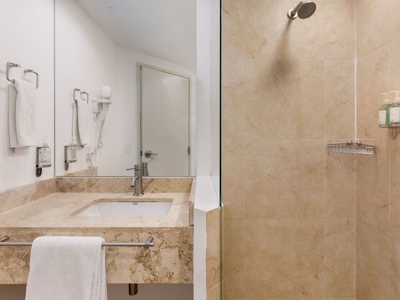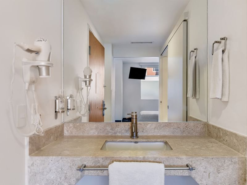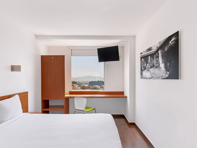 Te mereces un buen descanso cuando estás de viaje. Disfruta de un espacio cómodo y agradable. Tu habitación cuenta con una cama Queen, clóset, escritorio de trabajo, internet inalámbrico gratuito, teléfono, TV por cable, aire acondicionado y calefacción. Dispones de múltiples contactos para seguir conectado con el mundo. Nuestras amenidades son generosas y cuidan el planeta. Cuando llega el momento de dormir, las persianas black-out crearán la atmósfera ideal para tener dulces sueños.