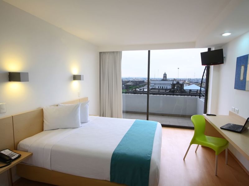 Tu alojamiento será amigable en esta habitación con balcón y una linda vista a la plaza. La pasarás increíble porque aquí tienes justo lo que necesitas. Descansa, siéntete seguro y cómodo. Cuenta con una cama Queen, clóset, escritorio de trabajo, internet inalámbrico gratuito, teléfono, correo de voz, TV por cable, clóset, aire acondicionado y calefacción. Dispones de múltiples contactos para seguir conectado con el mundo. Nuestras amenidades son generosas y cuidan el planeta. Cuando llega el momento de dormir, las persianas black-out crearán la atmósfera ideal para tener dulces sueños.