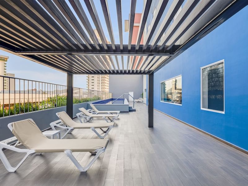 Para que tengas un momento agradable, vista la alberca al aire libre con área de camastros y mesas.
