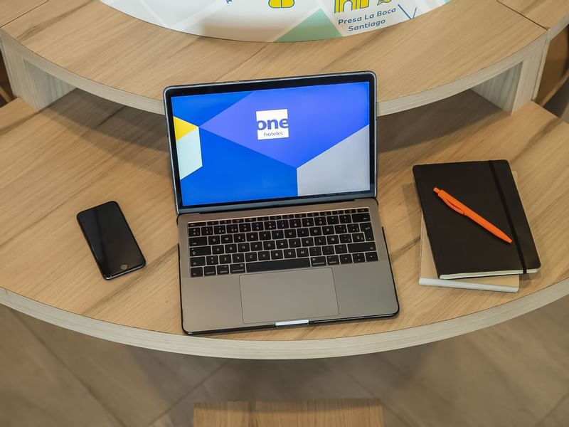 Primer plano de un ordenador portátil sobre un escritorio montado en la pared en One Hotels