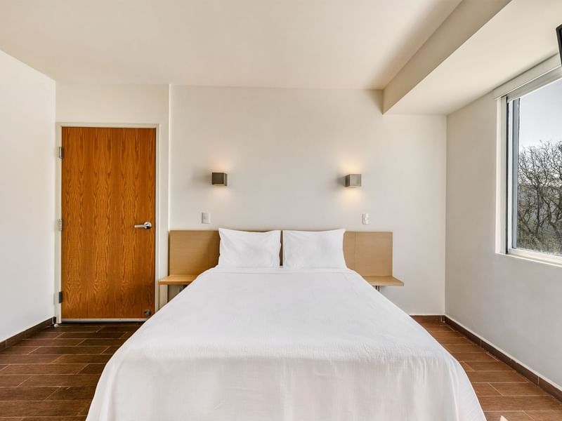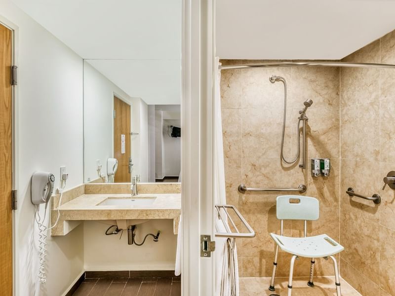 Un espacio cuidadosamente diseñado para que tengas una estancia agradable y segura, con facilidades especiales que te harán sentirte cómodo. Cuenta con los mismos servicios que las habitaciones estándar, pero con fácil acceso para silla de ruedas, pasamanos de seguridad en regadera, baño y tina, así como TV por cable, internet inalámbrico gratuito y cama Queen Size. Está comunicada con una habitación con dos camas individuales. Dispones de múltiples contactos para seguir conectado con el mundo. Nuestras amenidades son generosas y cuidan el planeta. Cuando llega el momento de dormir, las persianas black-out crearán la atmósfera ideal para tener dulces sueños.
