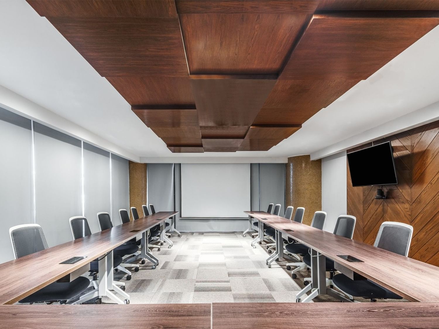 Sala de juntas, ideal para grupos pequeños hasta para 30 personas. Cuenta con audio integrado, proyector y pantallas.