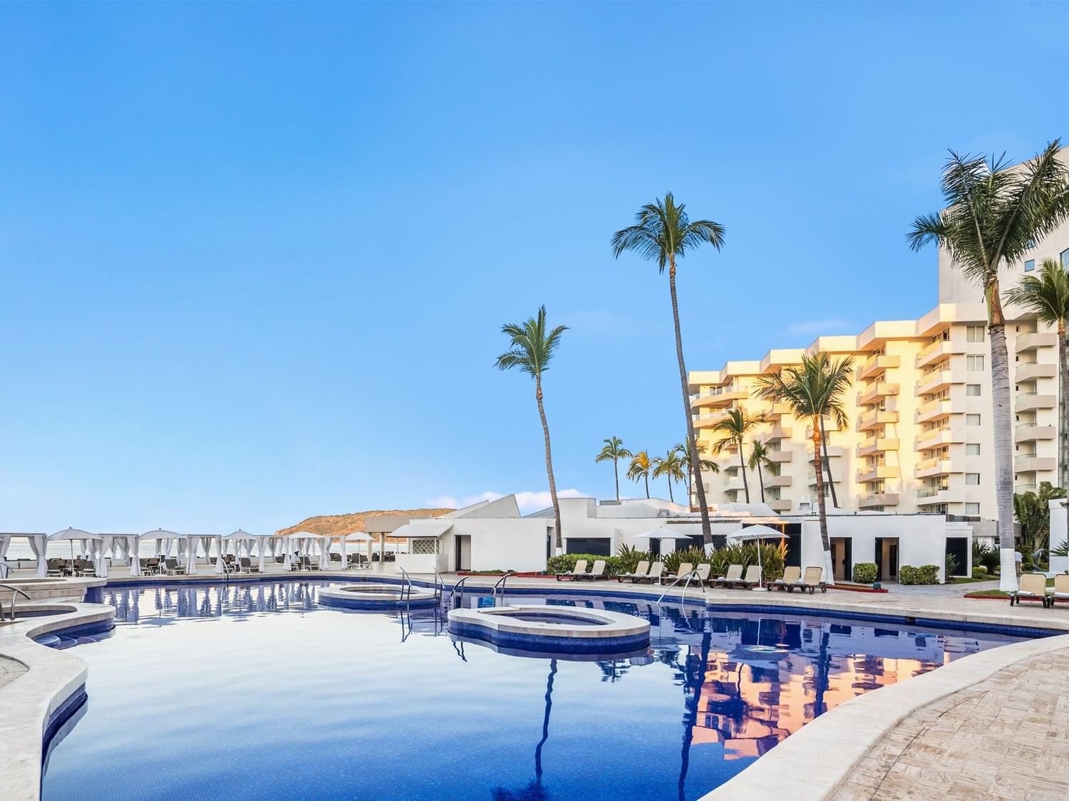 Alberca principal climatizada, con profundidad de 1.20mt, red de voleibol y jacuzzis para adultos. Segunda alberca climatizada solo para adultos. Rodeada de camastros y balinesas