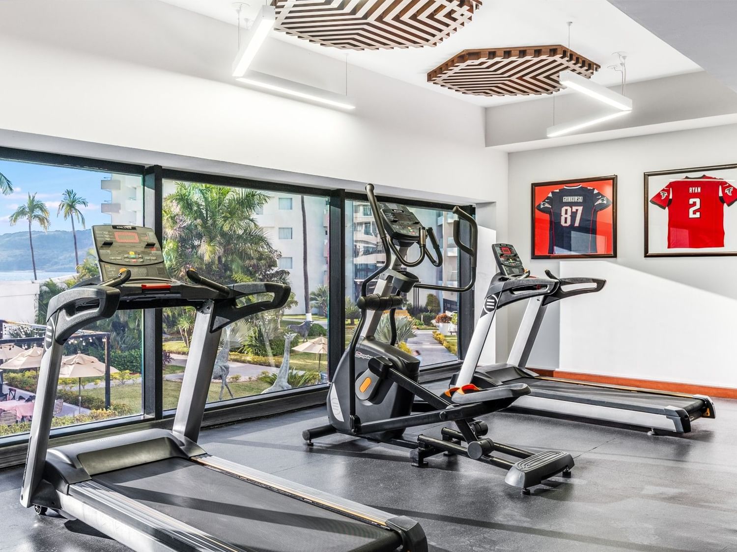 Gimnasio acogedor, equipado con caminadoras, pesas y aparatos para ejercitarse