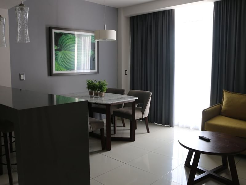 Con espacio para relajarse y compartir momentos alegres, esta Junior Suite ofrece un dormitorio privado con dos camas dobles y un baño completo, además de la comodidad de un segundo baño. Una acogedora sala de estar con sofá cama, mesa de comedor y cocina americana facilita disfrutar de las comidas y el tiempo juntos. Desde el balcón privado, disfrute de las impresionantes vistas al mar: ya sea comenzando la mañana con el sol o terminando el día con la puesta de sol, cada momento se convierte en un recuerdo alegre y duradero.