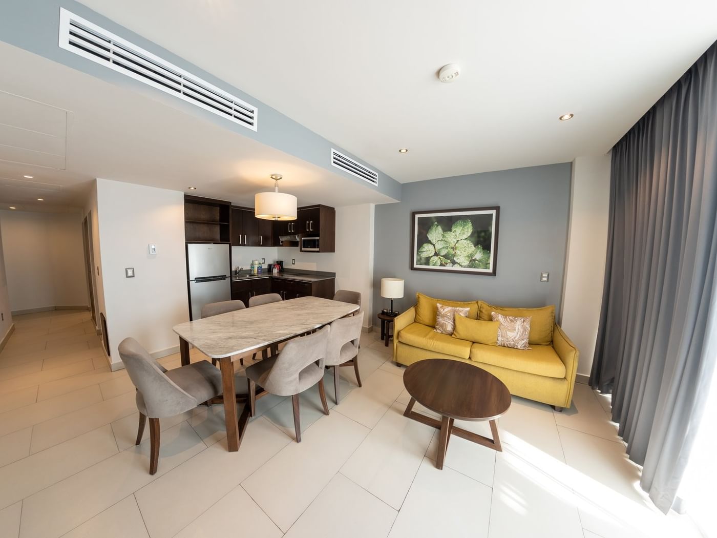 La suite de Lujo es el lugar donde se crean recuerdos felices. Con un dormitorio privado con dos camas dobles y un cuarto de baño completo, además de la comodidad de un segundo cuarto de baño, ofrece comodidad y facilidad. Una amplia sala de estar con sofá cama, comedor y una cocina totalmente equipada crean el entorno perfecto para compartir comidas, risas y relajación con sus seres queridos. Salga a su balcón privado para disfrutar de las impresionantes vistas al mar: cada amanecer y cada atardecer añaden belleza a los momentos que atesorará para siempre.