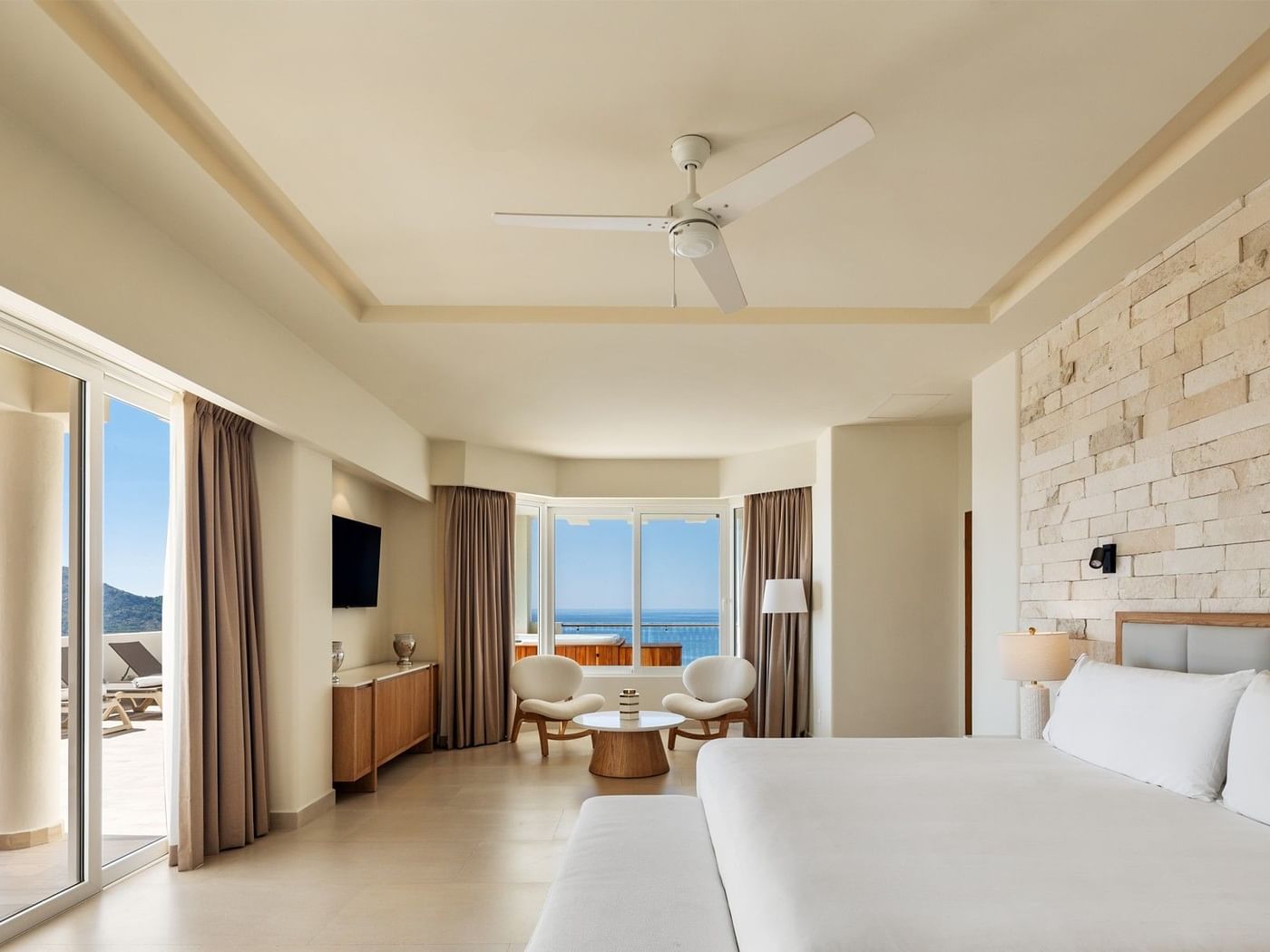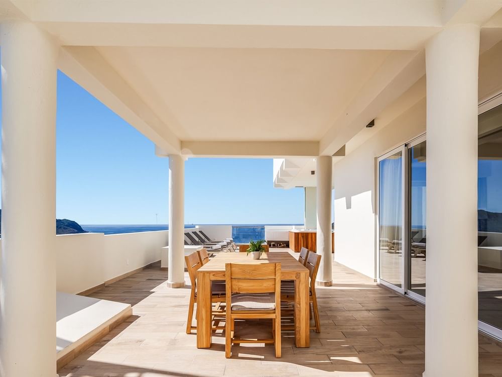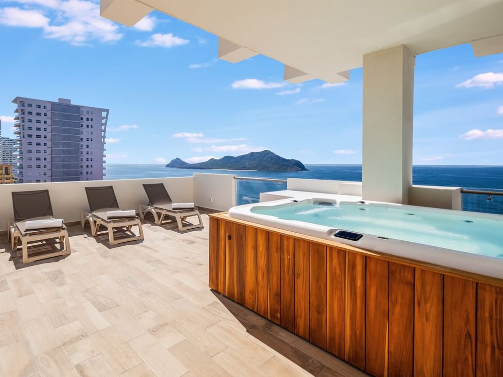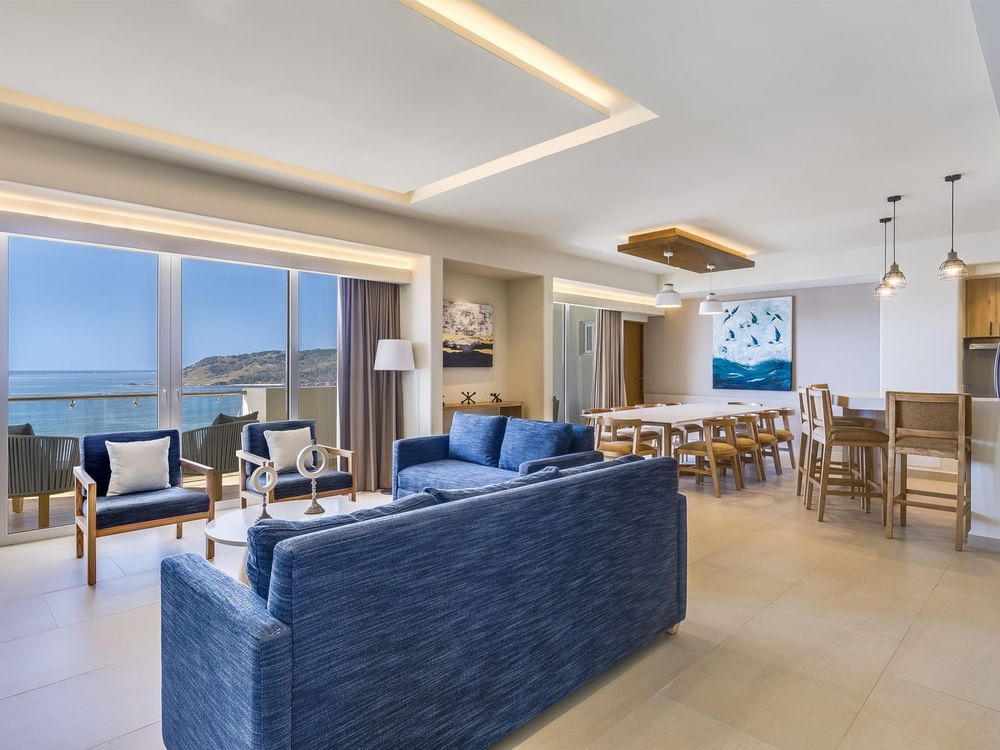 El Penthouse de tres habitaciones es un impresionante refugio diseñado para disfrutar de momentos inolvidables con la familia o los amigos. Uno de los dormitorios privados cuenta con una cama king size, un lujoso cuarto de baño completo y terraza con jacuzzi para una relajación total, mientras que los otros dos dormitorios privados incluyen dos camas dobles y sus propios cuartos de baño completos. Un cuarto baño completo en la zona común garantiza una mayor comodidad para todos. Con una cocina completa, un comedor para diez personas y una amplia sala de estar con sofá cama, este ático es perfecto para celebrar juntos los pequeños placeres de la vida. Salga a la terraza privada con jacuzzi y disfrute de las impresionantes vistas al mar: cada amanecer y cada atardecer se convertirán en un recuerdo inolvidable.