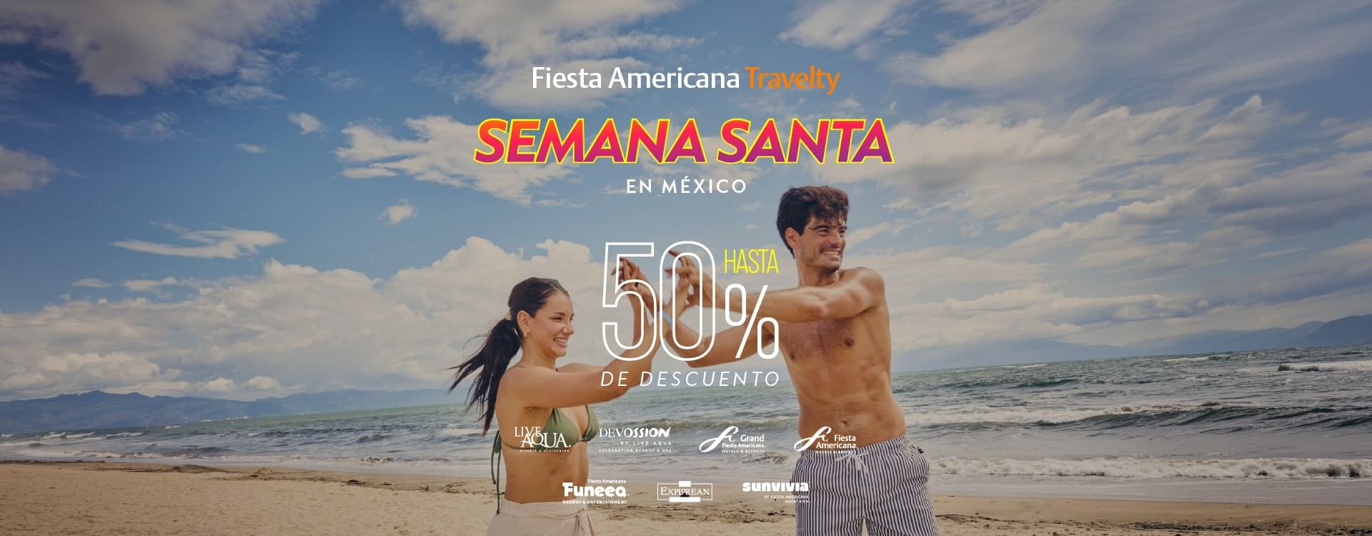 Promoción válida para reservar al 16 de marzo de 2026 y viajar al 12 de abril de 2026. *Transporte incluido. Recibe transportación incluida al reservar en nuestro sitio web mínimo 4 noches por habitación. Posterior a la confirmación recibirás un correo con las instrucciones para reservar tu transportación. La información del vuelo debe ser confirmada al menos 72 horas antes de tu llegada en los hoteles Live Aqua Cancún, Grand Fiesta Americana Coral Beach Cancún All Inclusive Spa Resort, Grand Fiesta Americana Los Cabos All Inclusive Golf & Spa, Fiesta Americana Condesa Cancún All Inclusive, Devossion by Live Aqua Playa del Carmen, Live Aqua Beach Resort Punta Cana, Fiesta Americana Funeeq Punta Cana, Fiesta Americana Riviera Nayarit, Fiesta Americana Puerto Vallarta All Inclusive & Spa y The Explorean Selva Maya Kohunlich durante la vigencia de esta promoción. Para las reservaciones de 4 noches en adelante en las Sundeck, Zen Suite, Aqua Suite y Residences a través de nuestro sitio web. En el hotel Live Aqua San Miguel de Allende se incluye el transporte ida y vuelta desde el Aeropuerto: BJX Aeropuerto Internacional del Bajío y QRO Aeropuerto Internacional de Querétaro. El porcentaje de descuento se aplicará sobre la tarifa pública con impuestos indicada en las páginas propiedad de Grupo Posadas. El descuento adicional se aplica a la tarifa ya rebajada. El porcentaje de descuento de cada hotel se encuentra publicado en la página www.fiestamericanatravelty.com/ofertas/semana-santa. En hoteles en plan europeo, el descuento se aplicará únicamente sobre la tarifa por noche. Para consultar disponibilidad en los hoteles, el cliente puede marcar al 800 504 5000 o ingresar datos de destino, número de huéspedes y fechas deseadas de estancia en los sitios web de Grupo Posadas, los cuales informarán al momento si existe disponibilidad. En caso de no haber fechas disponibles, el cliente deberá intentar fechas distintas. Estas promociones no aplican para reservaciones de más de 10 habitaciones en modalidad de grupos ni con otras promociones. La participación en esta promoción implica el conocimiento y comprensión por parte del Consumidor de los términos y condiciones que la rigen. Responsable de la promoción: Grupo Posadas, S.A.B. de C.V., Prolongación Paseo de la Reforma 1015. Piso 9. Torre A. Col. Santa Fe Cuajimalpa, Alcaldía Cuajimalpa, C.P. 05348, Ciudad de México. En caso de que exista algún inconveniente o duda respecto a la redención de tu beneficio, te podrás comunicar al correo electrónico de asistenciasclientes@posadas.com en horario de lunes a viernes de 8:00 a 15:00 horas. Para consultar las bases de esta promoción, es necesario ingresar al sitio www.fiestamericanatravelty.com/ofertas/semana-santa. En los hoteles señalados en el sitio www.fiestamericanatravelty.com/ofertas//semana-santa se otorgará hasta 25% de descuento en todos los consumos de comidas y cenas en centros de consumo o room service en hoteles participantes. Este descuento no aplica en desayunos o brunch.